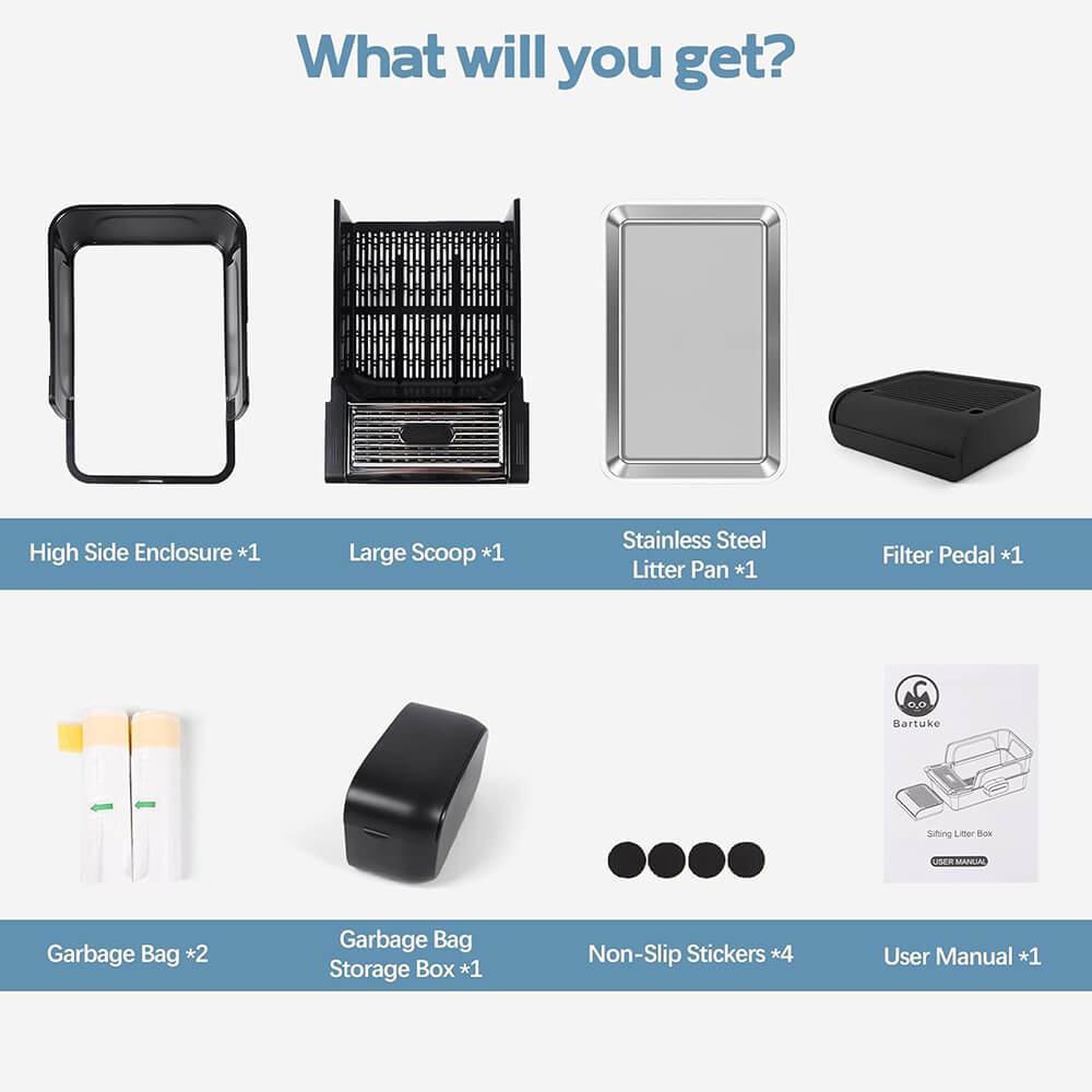 Our stainless steel litter box comes with 2 rolls of garbage bags to store abandoned waste. The side storage box is specially built to store garbage bags, helping you get rid of the problem of placing them randomly