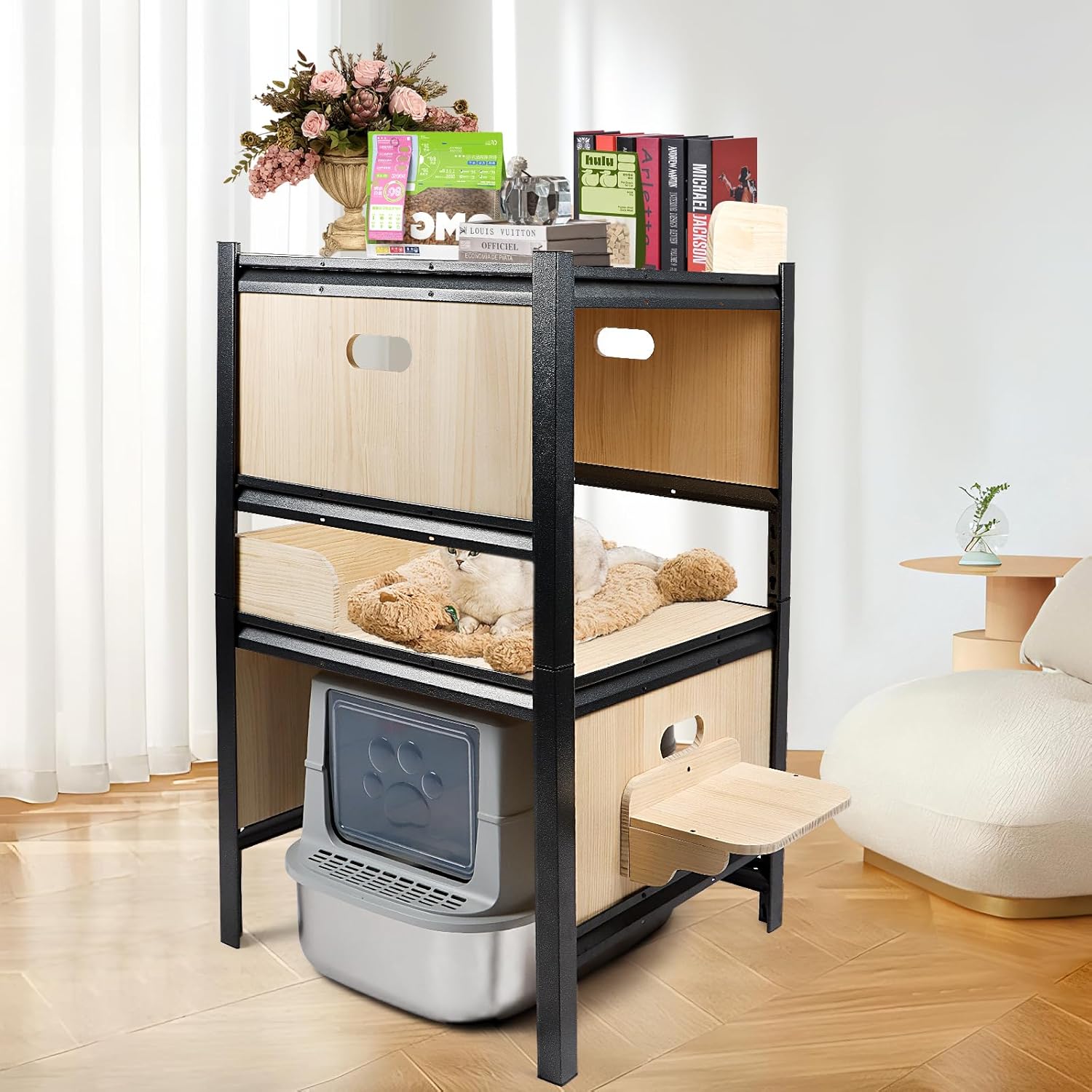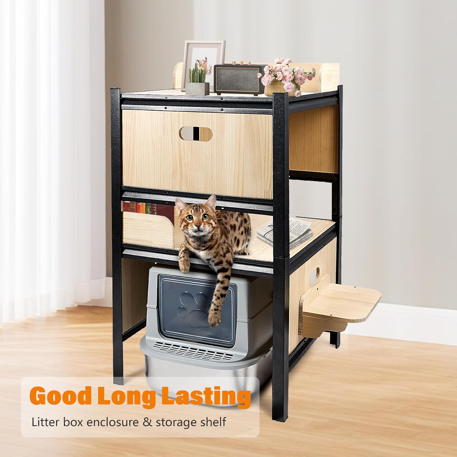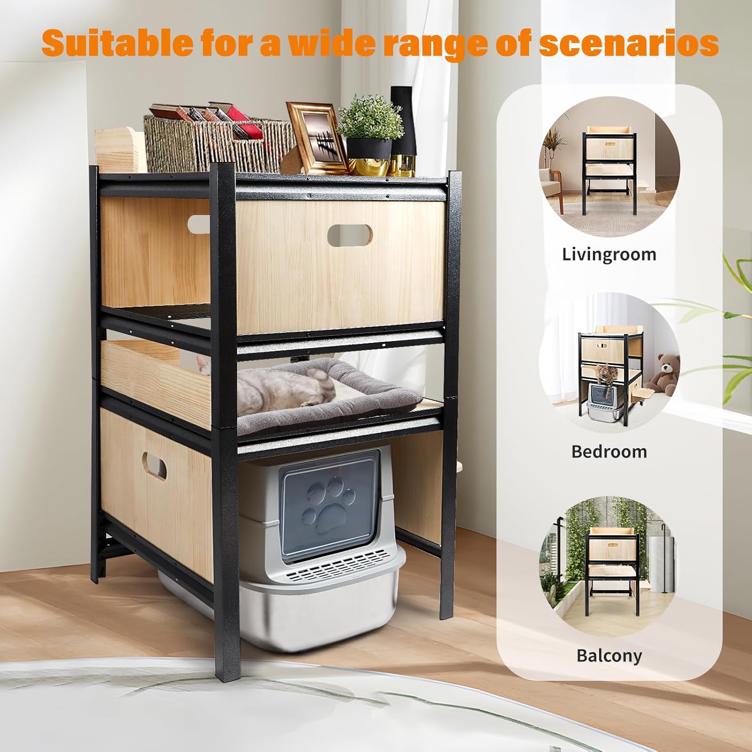 - 2-in-1 Design – Combines a hidden litter box or pet bed below with storage shelves on top for cat food, litter, or supplies.