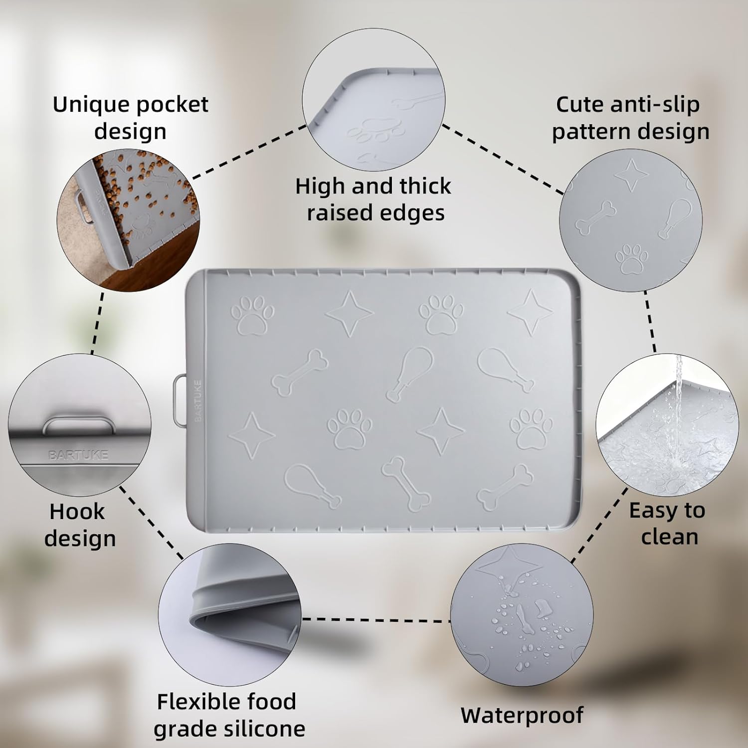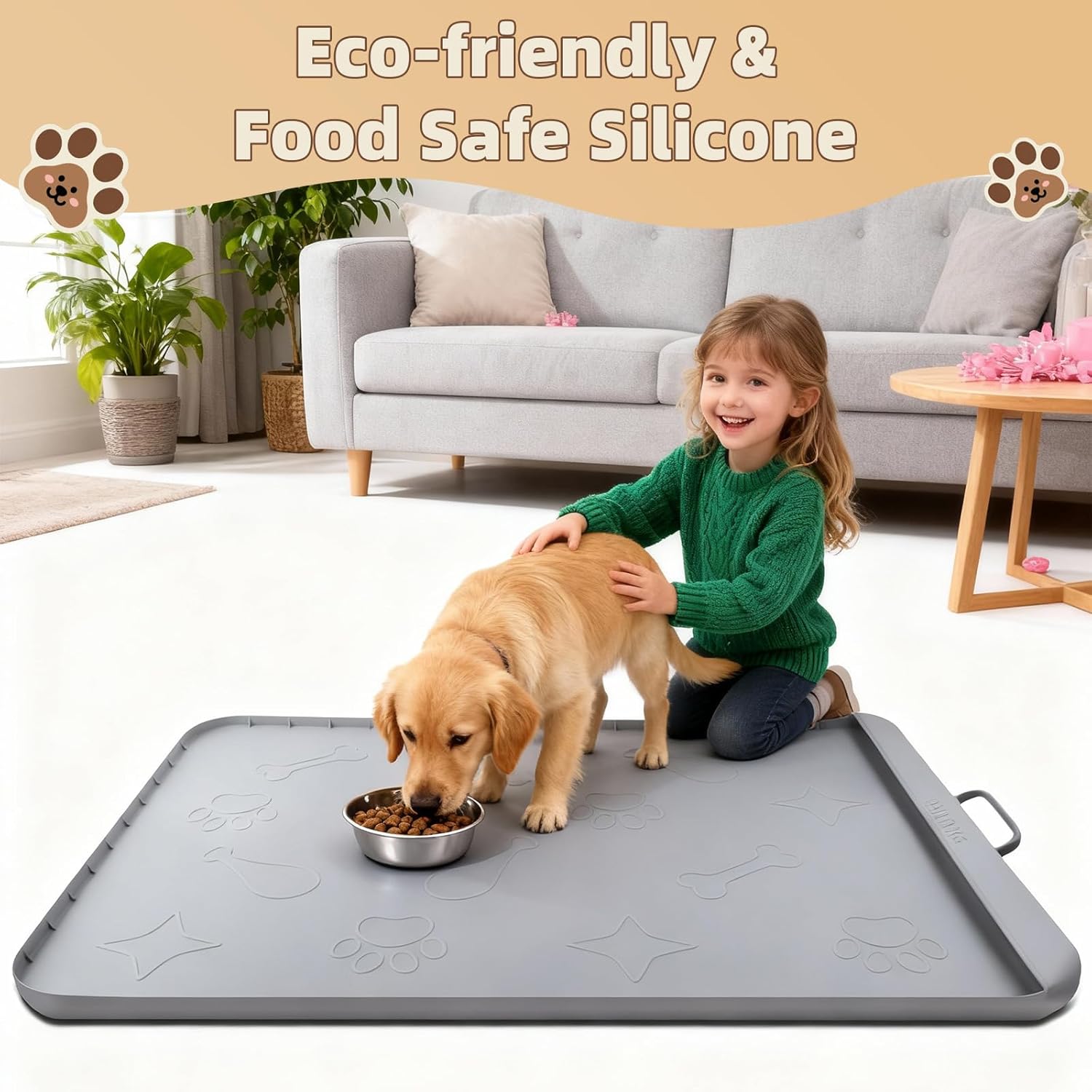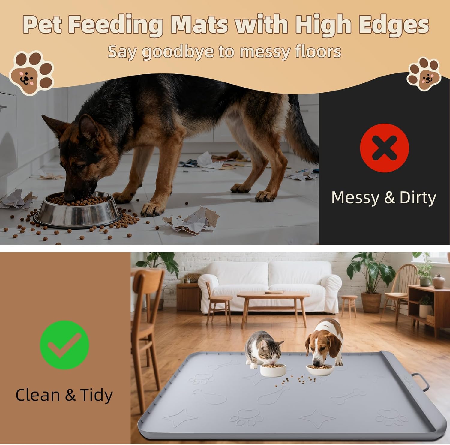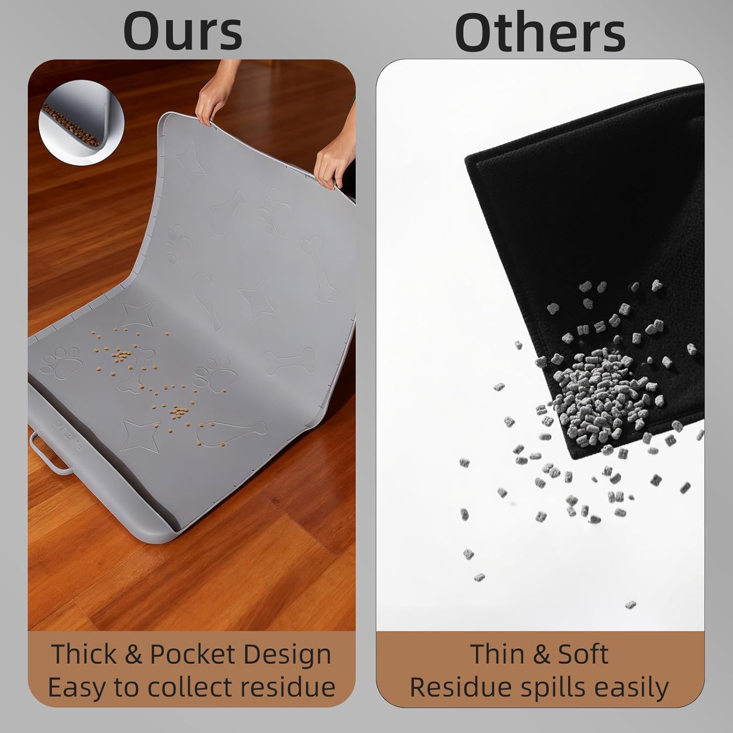 The thick, durable silicone mat features a built-in pocket that collects spilled food and water residue effortlessly. Compared to standard mats, this design keeps your floors cleaner and makes post-meal cleanup quick and stress-free.
