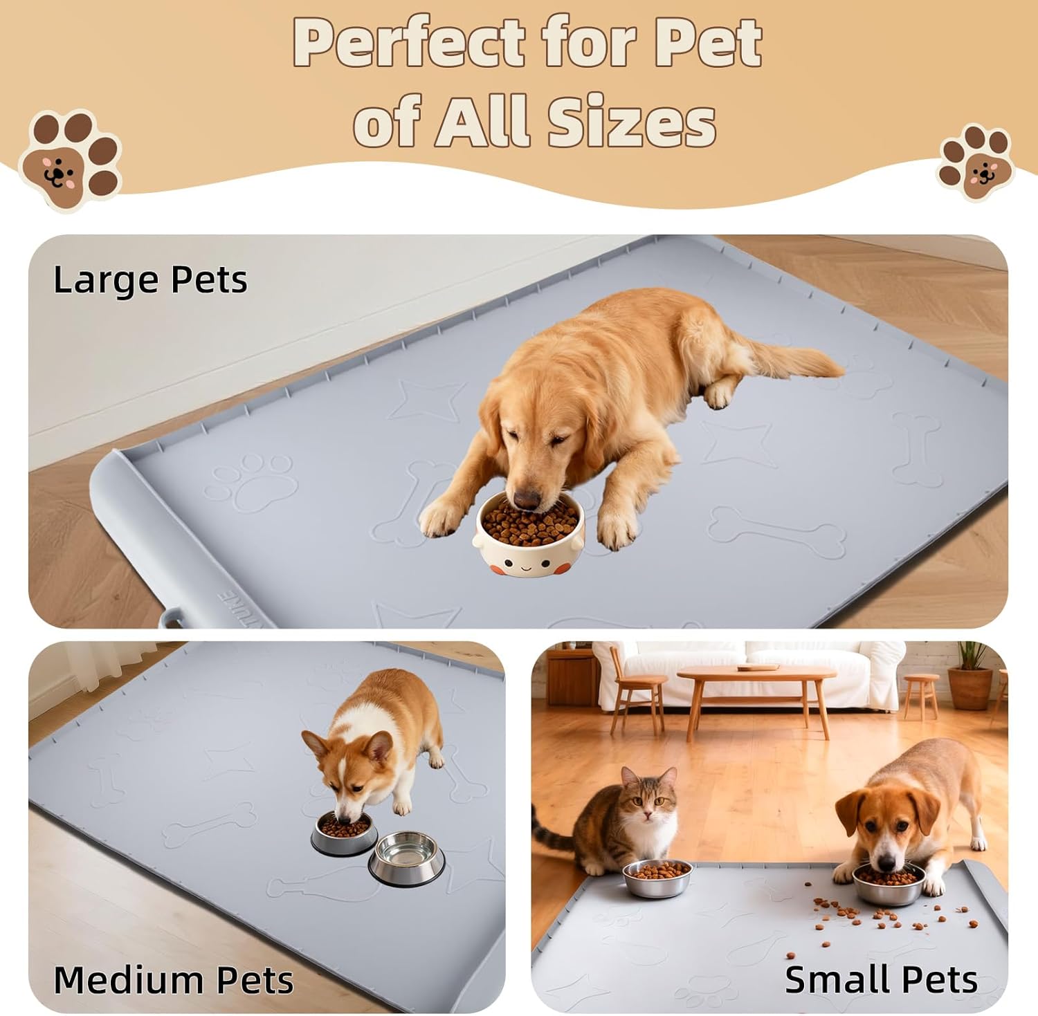 This extra-large silicone dog mat provides ample space for small, medium, and large pets to eat comfortably. Its generous dimensions and durable design make it suitable for multi-pet households, ensuring mealtime is clean and stress-free for every pet.