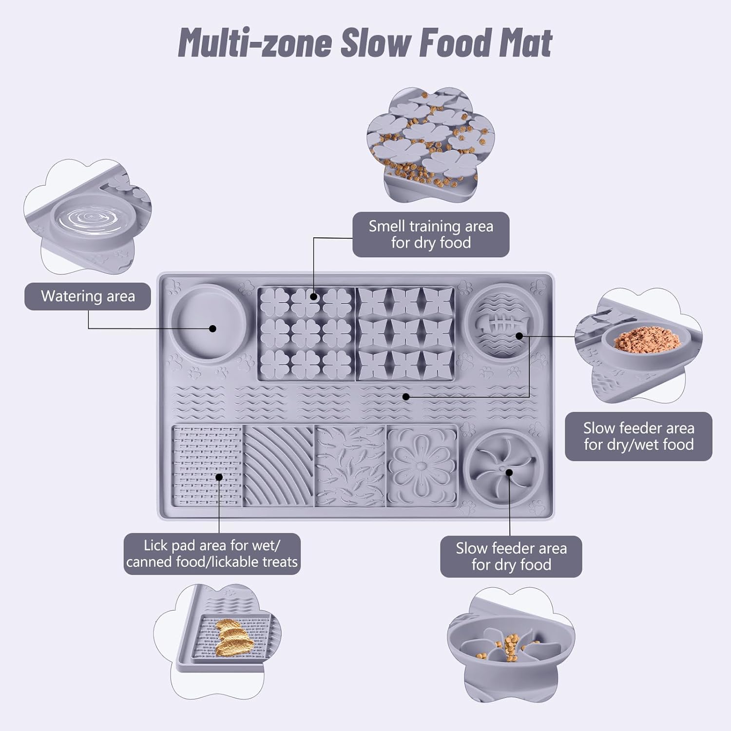 - 4-in-1 Multifunctional Feeder – Combines a slow feeder bowl, water bowl, snuffle lick mat area, and snuffle mat zone to support daily eating, foraging, and enrichment needs.
