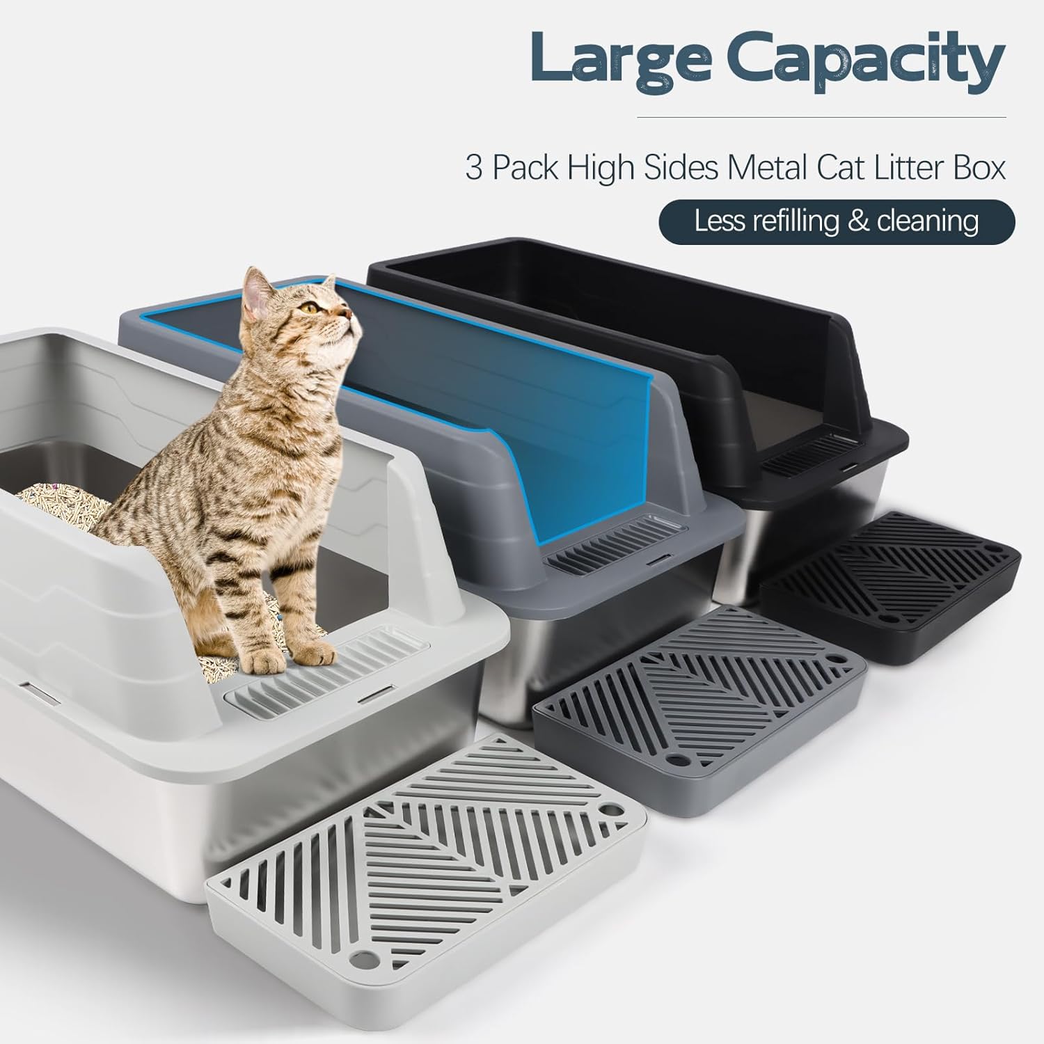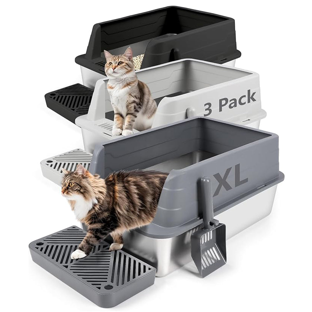 XL 3 Pack Black/Dark&Light Gray Stainless Steel Litter Box with Filter Pedal