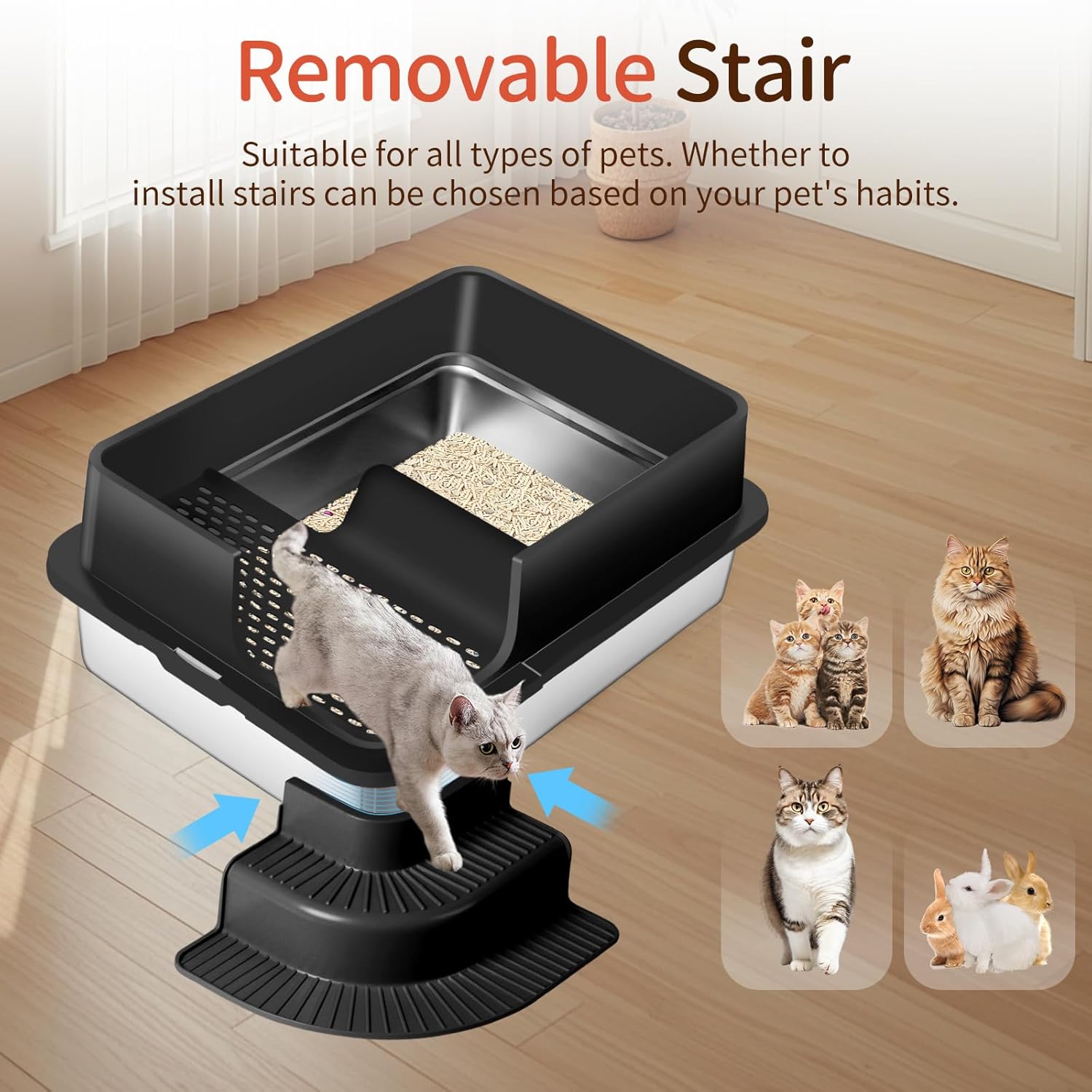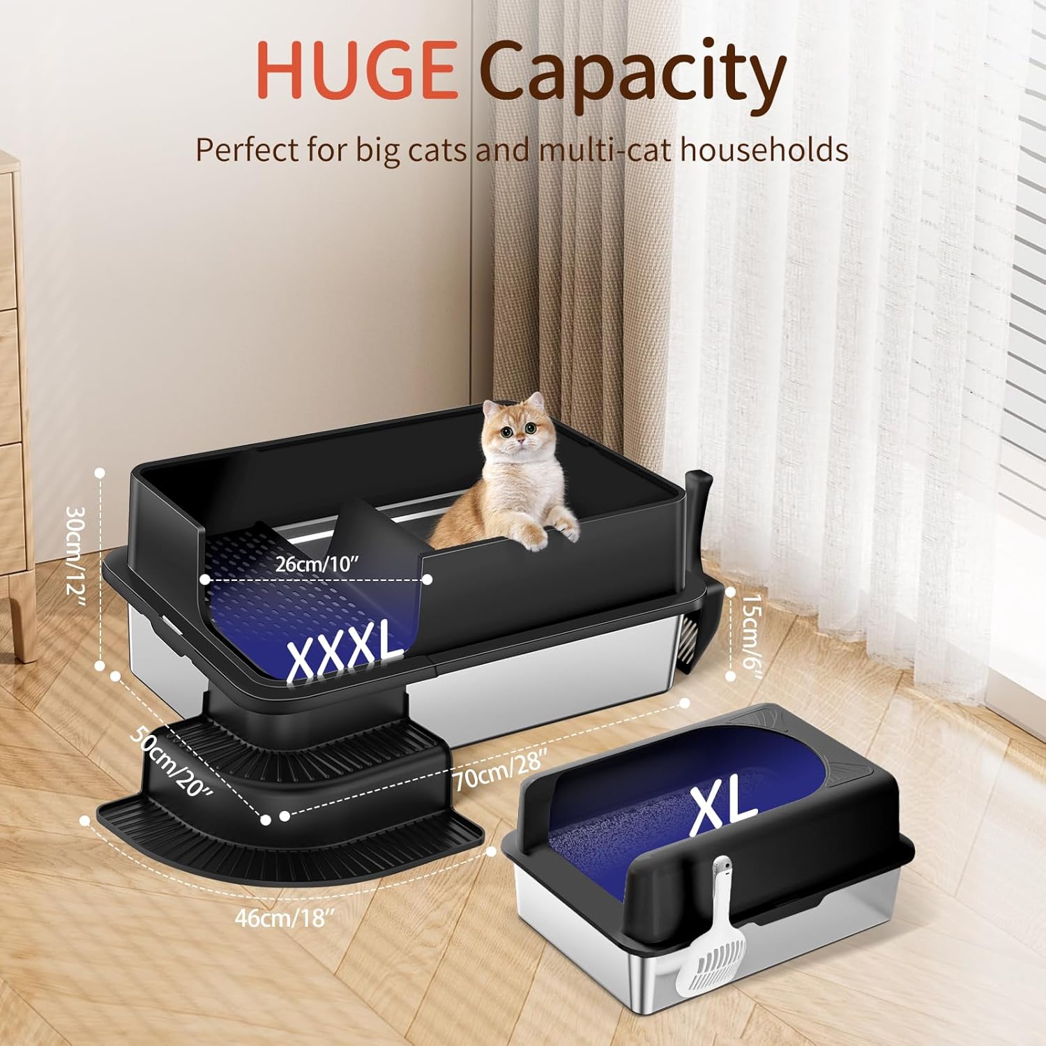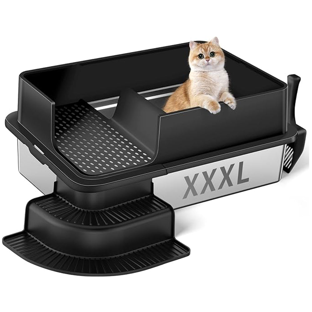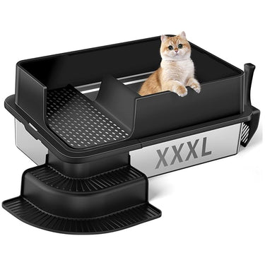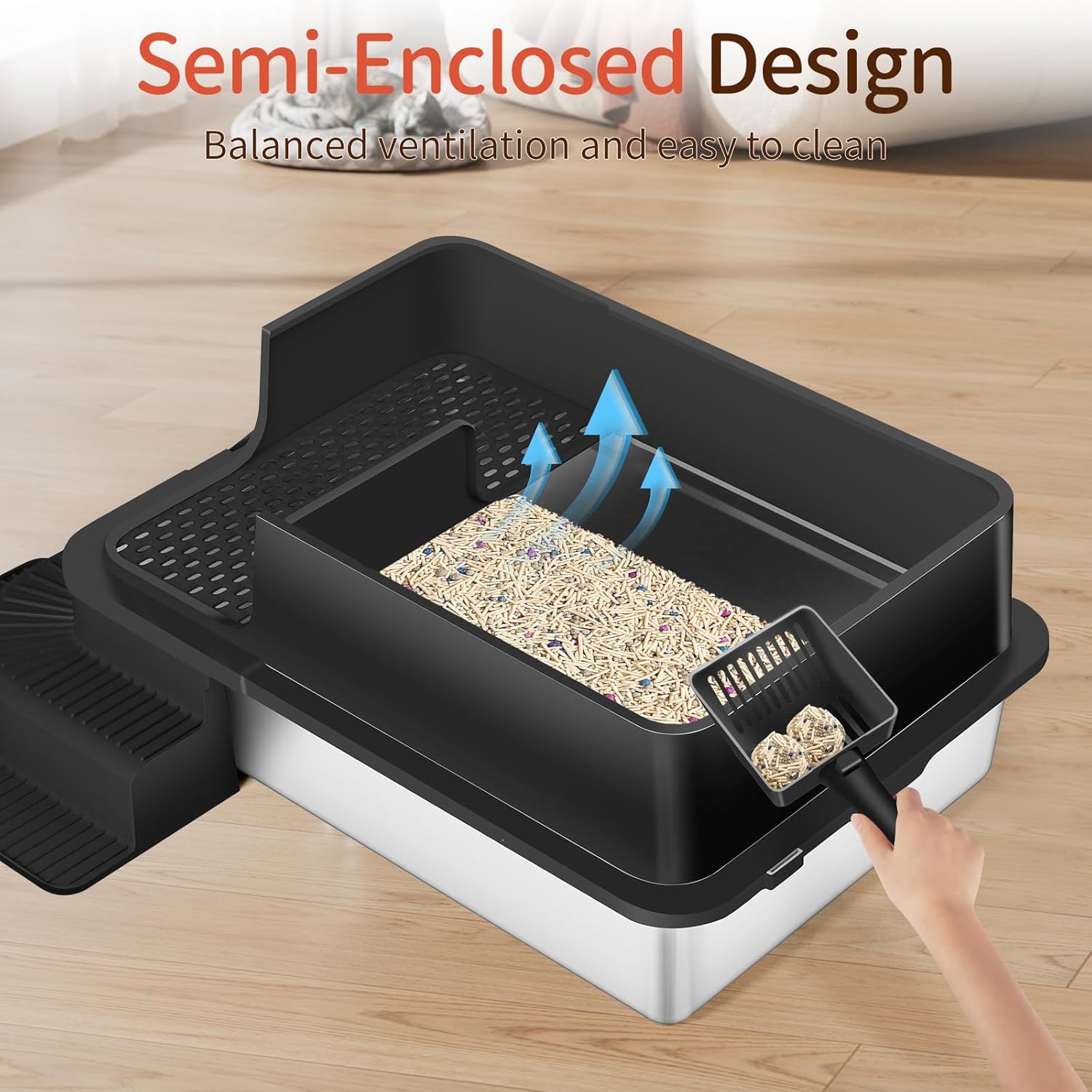 XXXL Black Semi Enclosed Stainless Steel Litter Box with Step