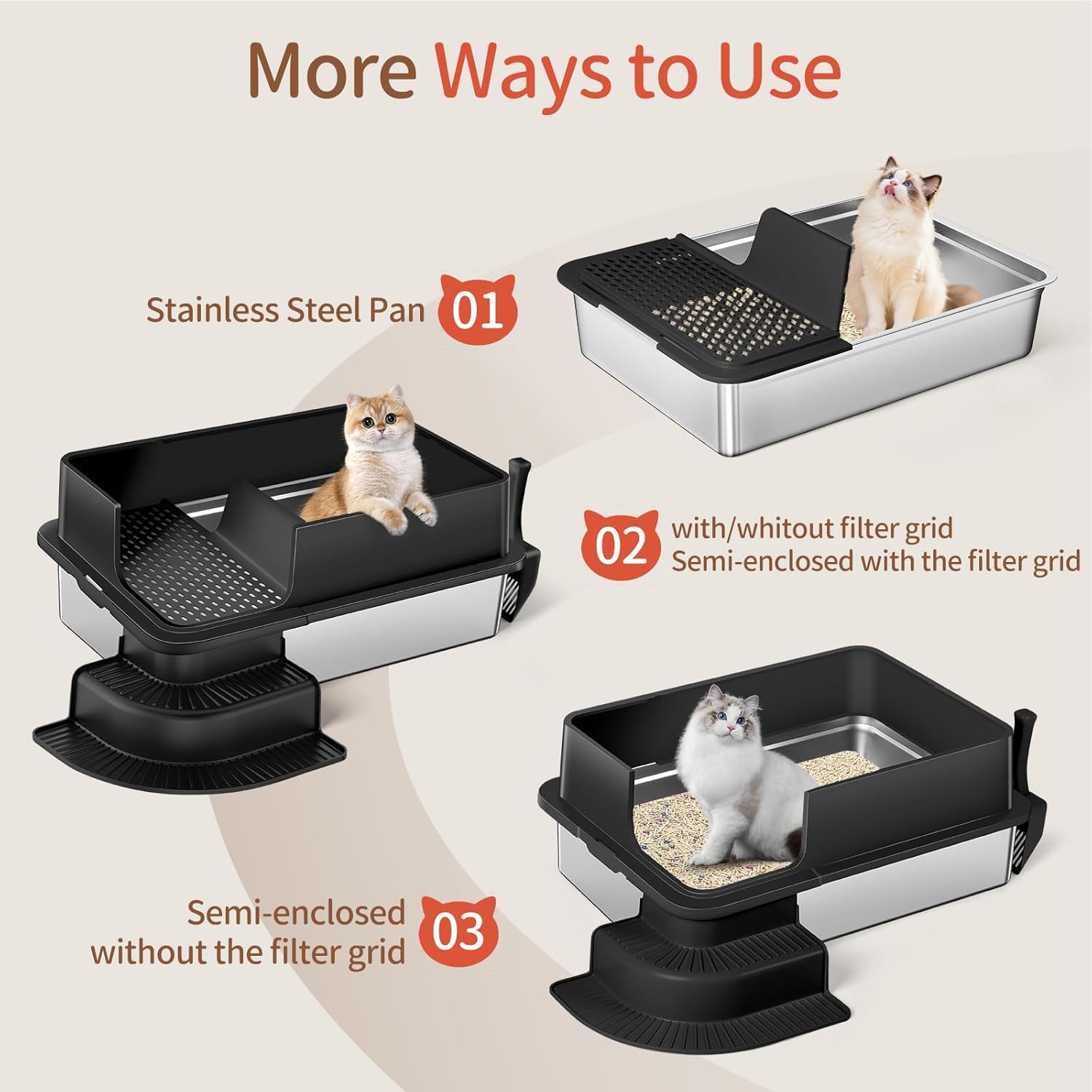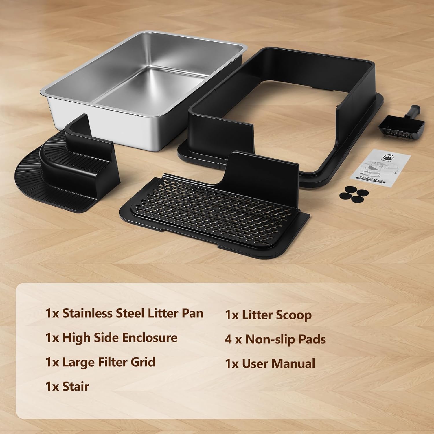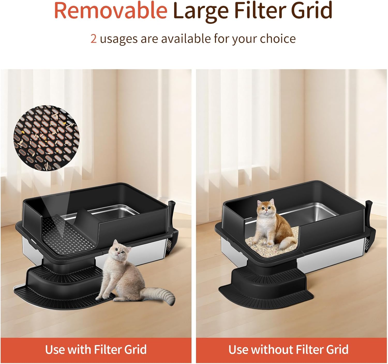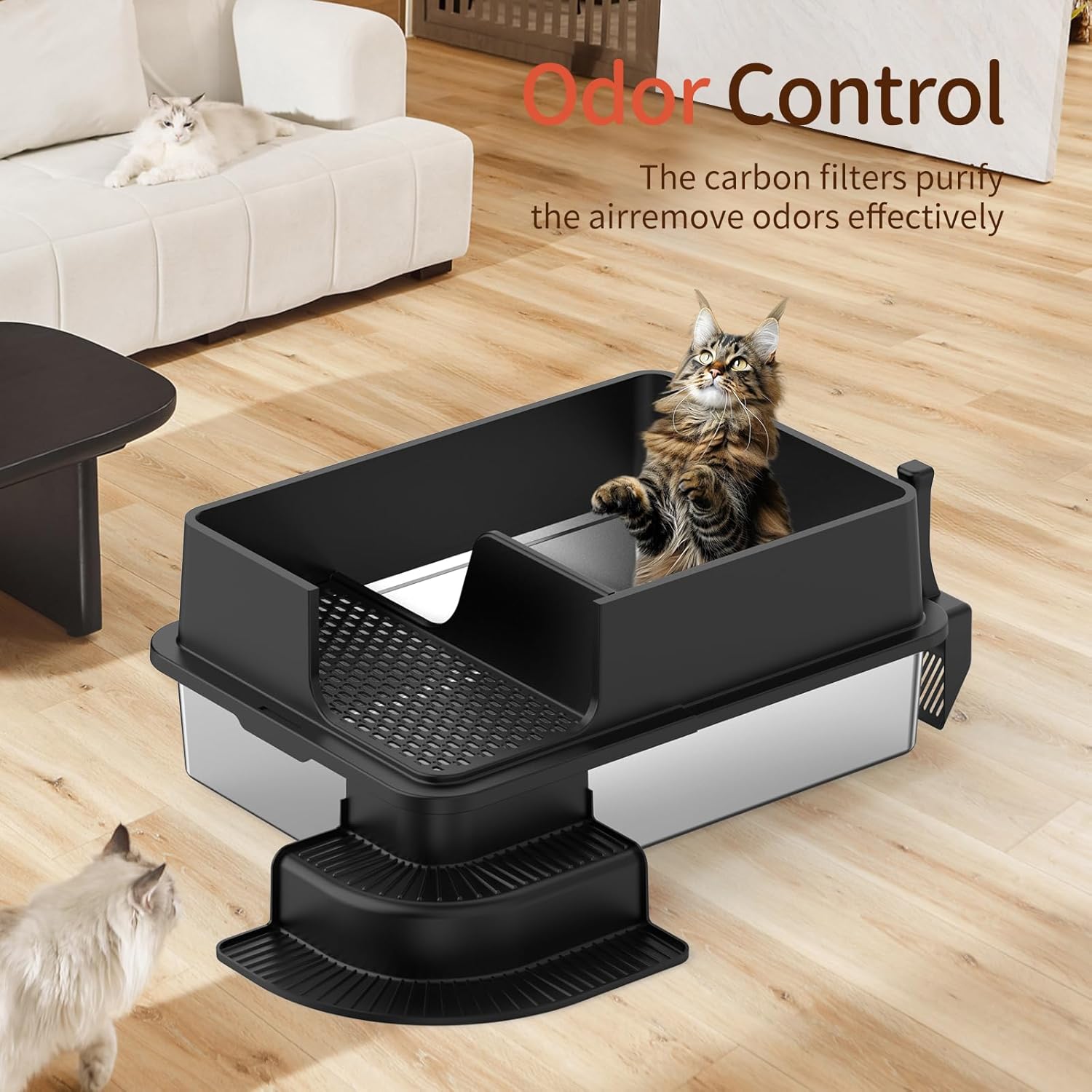 XXXL Black Semi Enclosed Stainless Steel Litter Box with Step