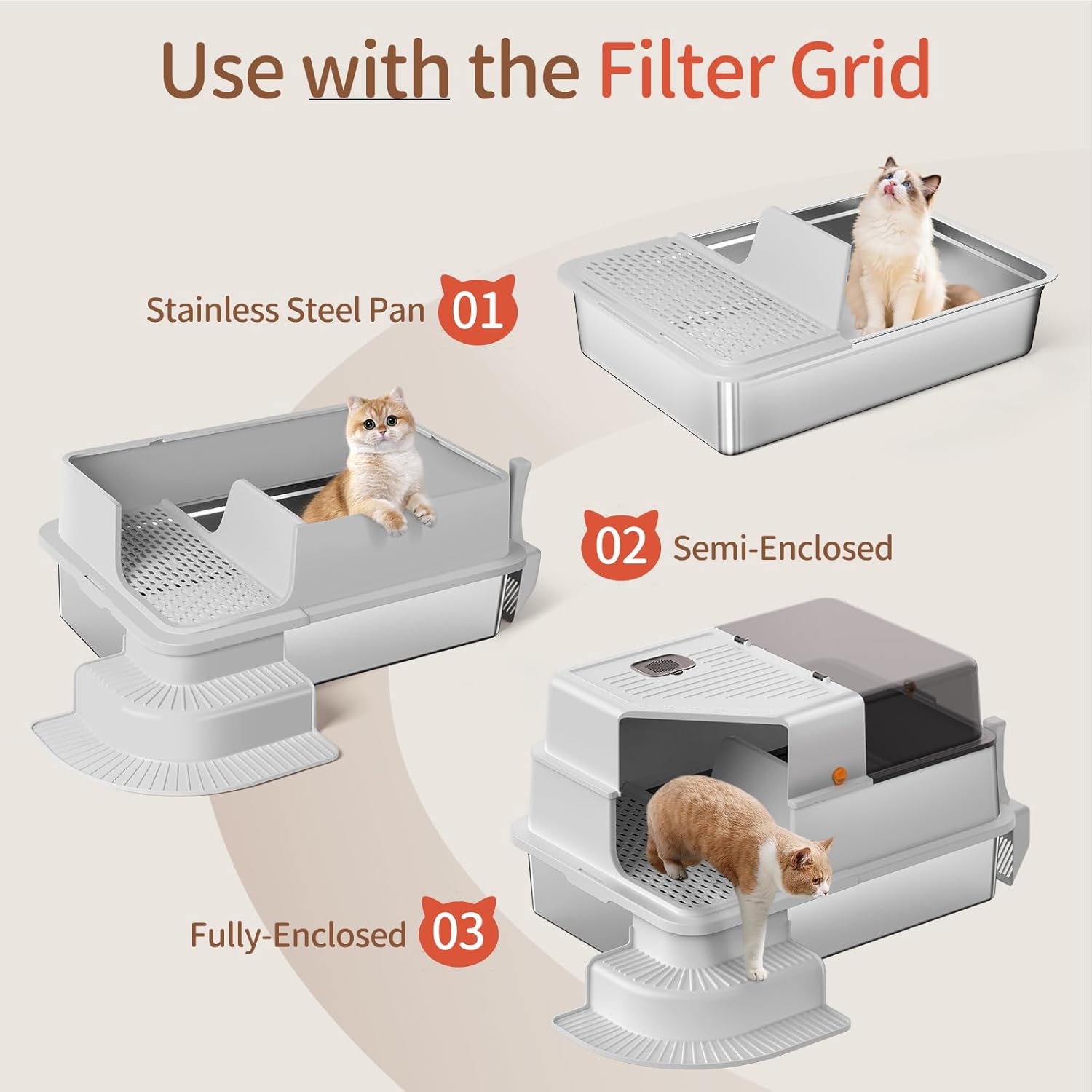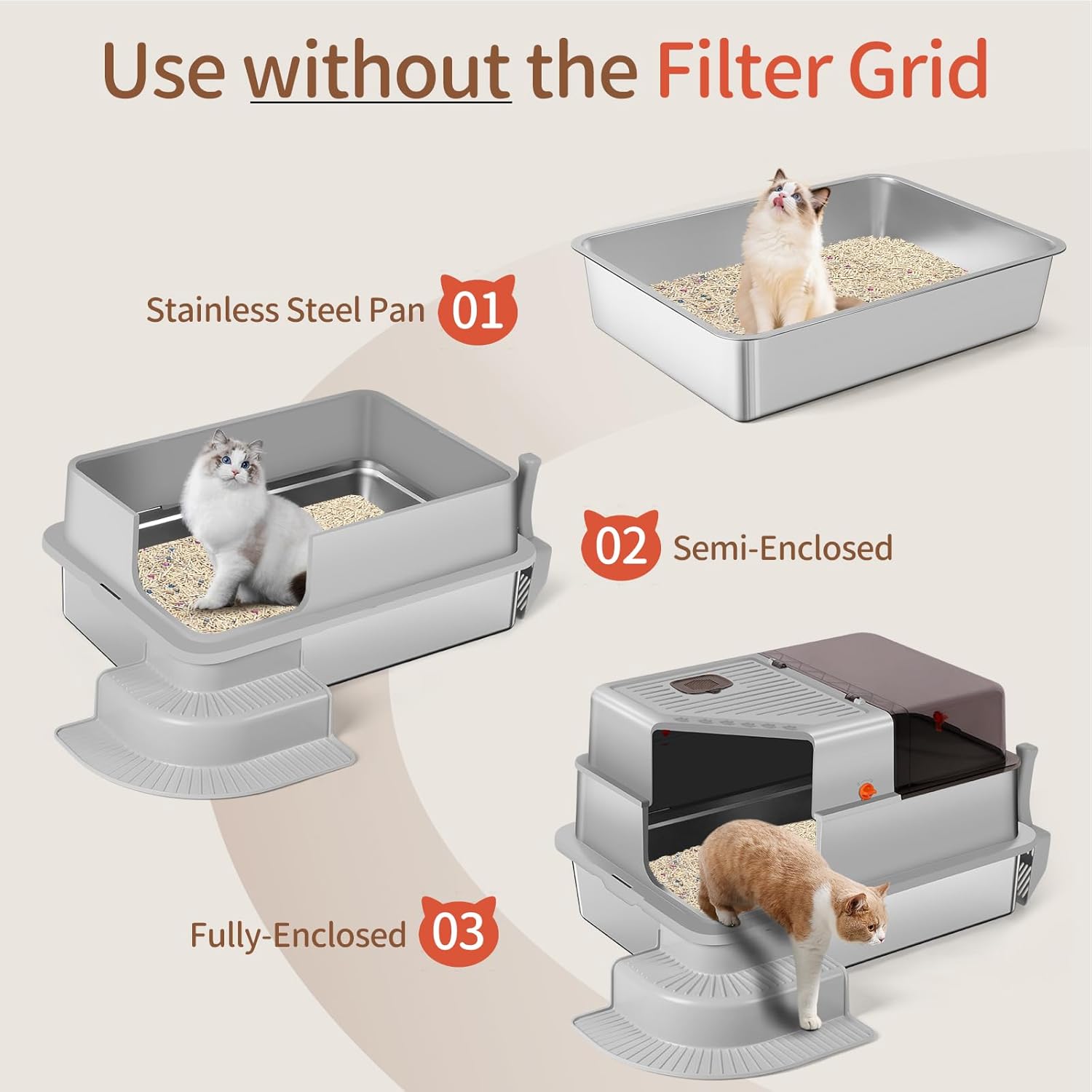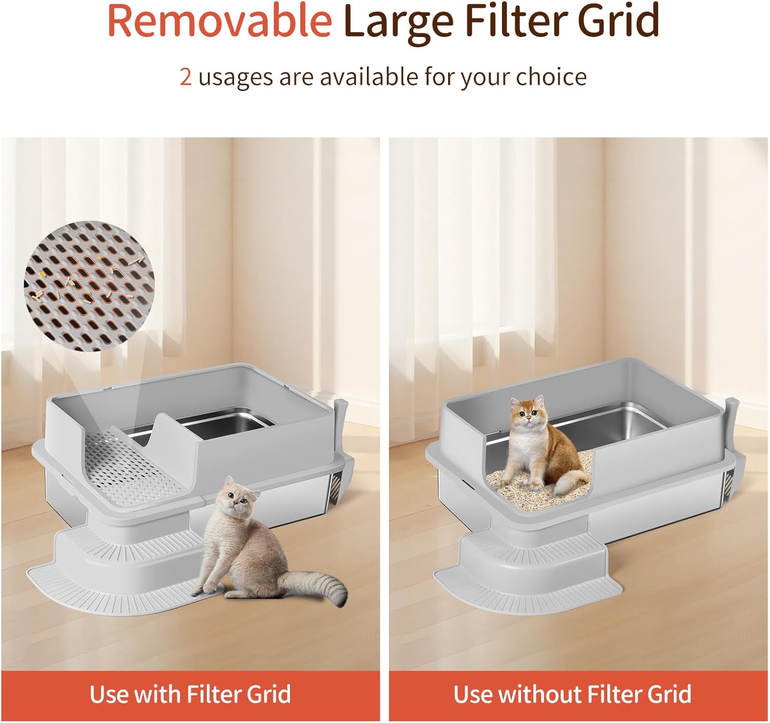 Equipped with a removable large filter grid, this stainless steel litter box allows you to choose between two setups: use the grid to trap litter and prevent scattering, or remove it for a fully open design. Keeps your floors cleaner while giving you flexibility to suit your cat’s preferences.