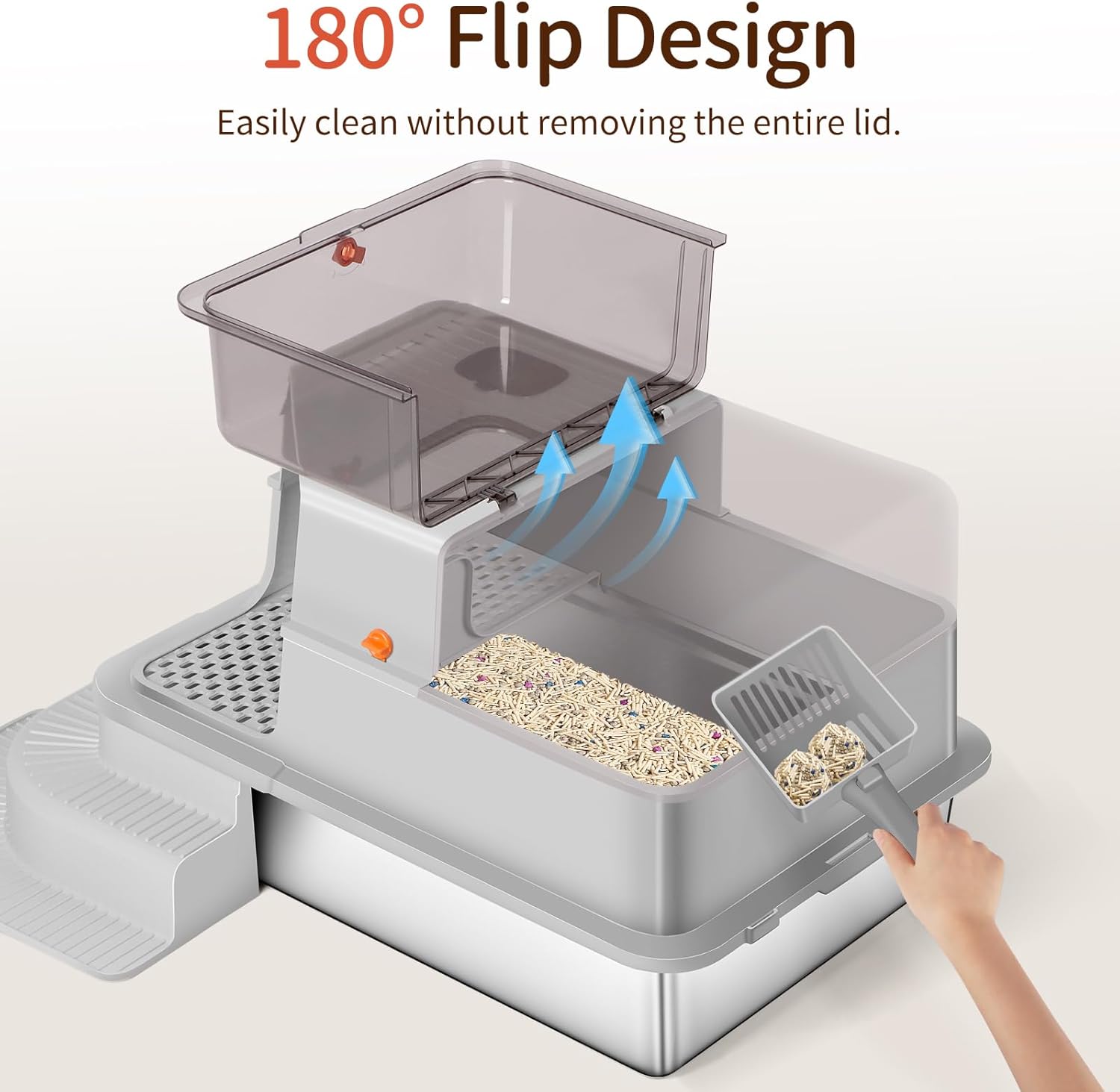 The 180° flip-top lid allows you to clean your cat’s litter box quickly without fully removing the cover. Paired with the included fine-mesh scoop, it makes scooping and maintaining hygiene faster, easier, and more convenient.