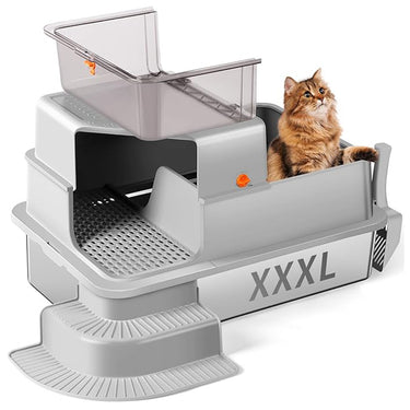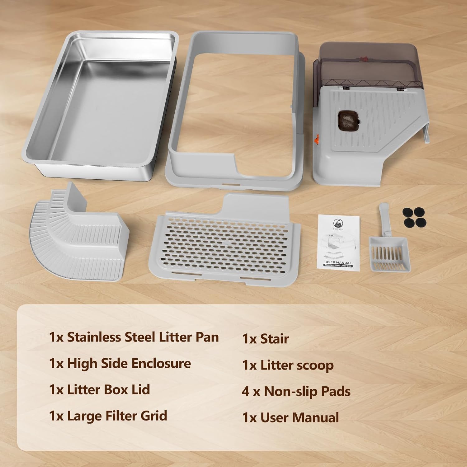 XXXL Light Gray Fully Enclosed Stainless Steel Litter Box with Step
