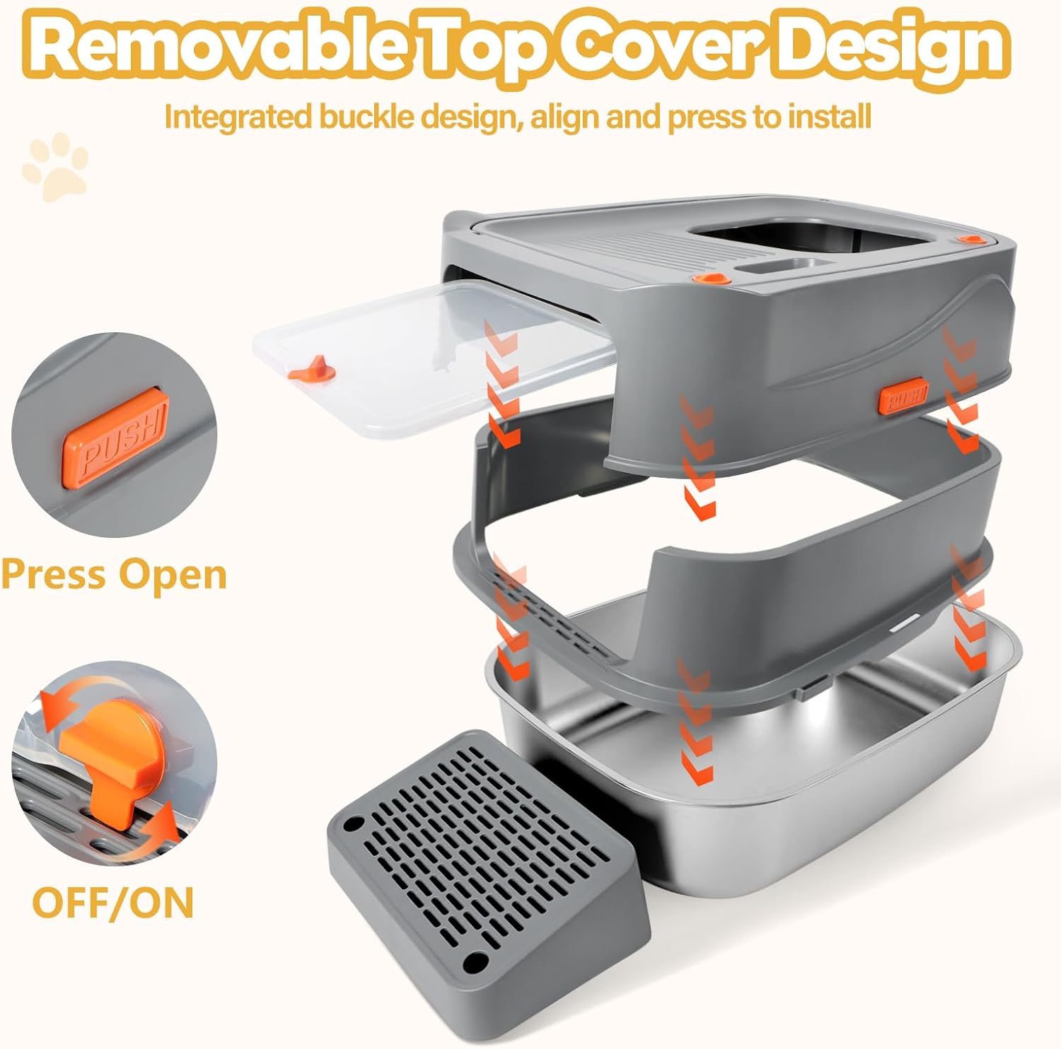 Dark Gray Stainless Steel Cat Litter Box with Cat Litter Mat