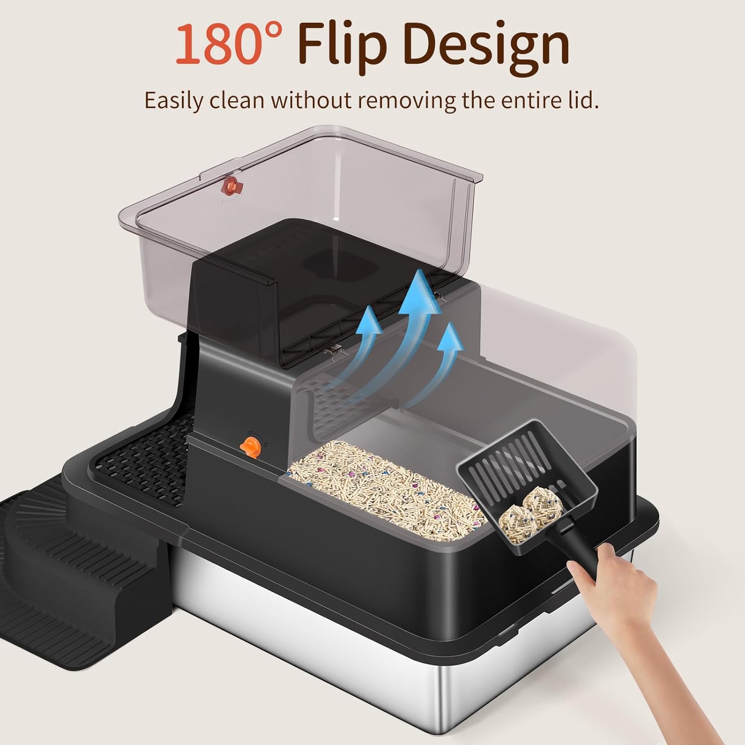 XXXL Black Fully Enclosed Stainless Steel Litter Box with Step